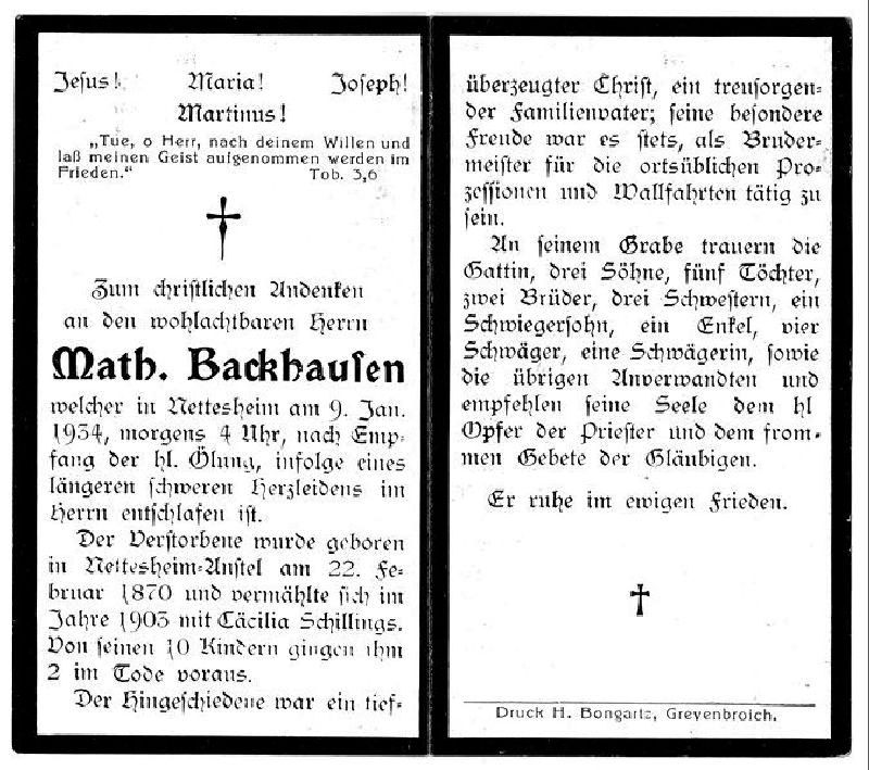 | Längeres, schweres Herzleiden; ∞ 1903 Cäcilia Schillings; 10 K., davon 2 †; Brudermeister bei Prozessionen und Wallfahrten |