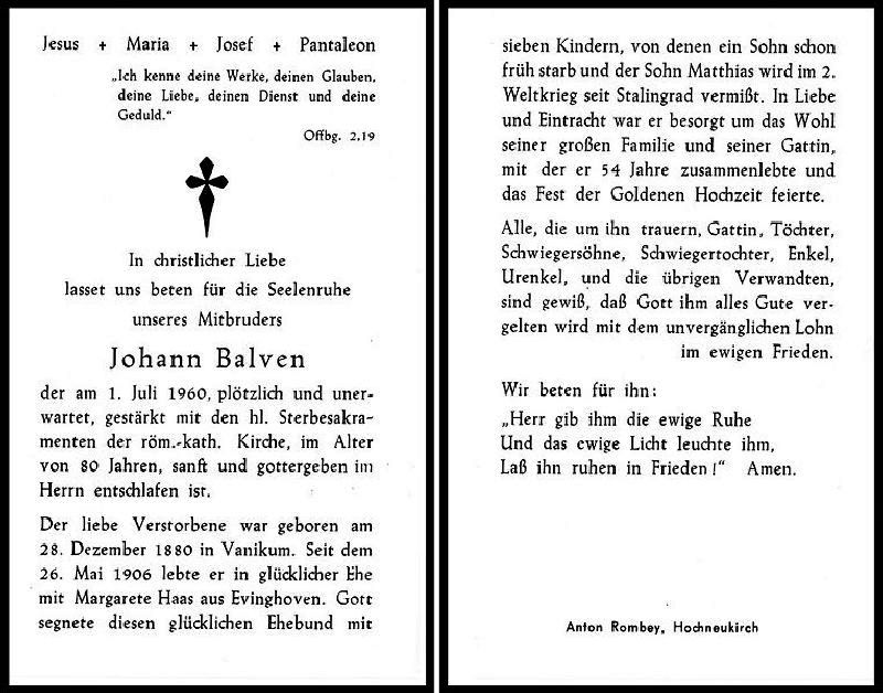 | ∞ 26.5.1906 Margarete Haas aus Evinghoven; 7 K., davon 1 Sohn früh † u. Sohn Matthias im 2. Weltkrieg bei Stalingrad vermisst; 54 J. Ehe; Druck in Hochneukirch |