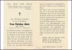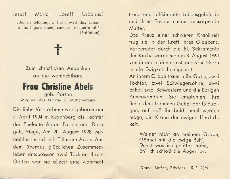 Eltern: Anton Porten u. Dora geb. Stege; ∞ 20.8.1928 Tillmann Abels; 2 Töchter; schwere Krankheit; Mitgl. Frauen- u. Mütterverein; Druck in Erkelenz |