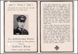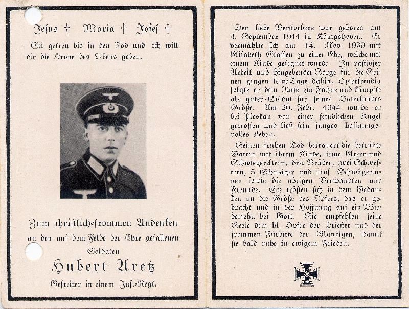 | Totenzettel-Nr.: | 27829 |  | Name: | Aretz |  | Vorname: | Hubert |  | Geburtsort: | Königshoven |  | Geburtsdatum: | 03.09.1911 |  | Sterbeort: | b. Pleskau |  | Sterbedatum: | 20.02.1944 |  | Bearbeiter: | Josef Wißkirchen |  | Sammlung: | Matthias Koch, Bedburg |  | Sonstiges: |  | Gefallener 2. Weltkrieg; ∞ 14.11.1939 Elisabeth Stassen; 1 K.; |  |