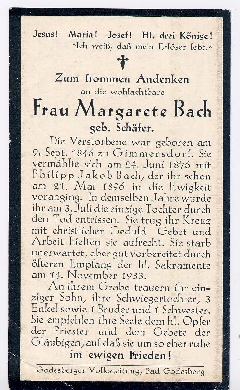 | ∞ 24.6.1876 Philipp Jakob Bach, † 21.5.1896; 2 K., davon1 Tochter † 3.7.1896; Druck in Bad Godesberg |