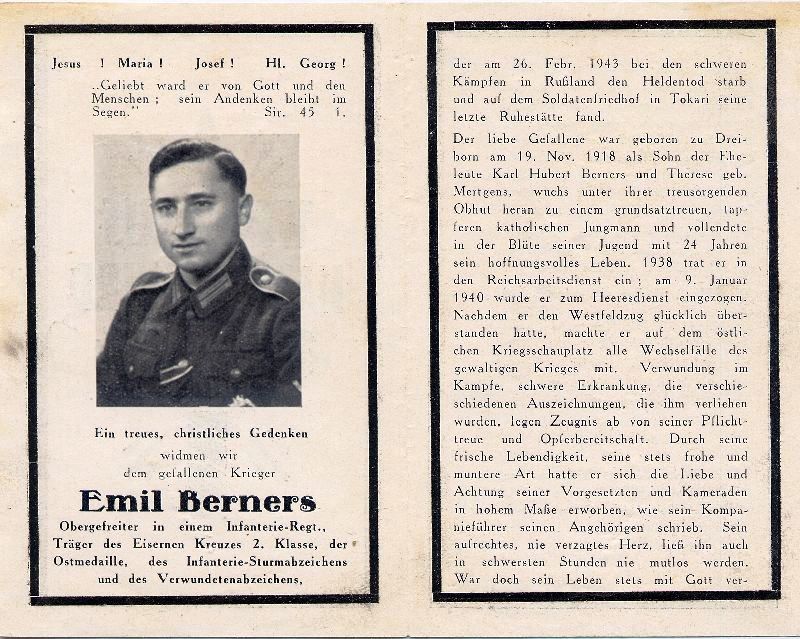 | Gefallener 2. Weltkrieg; Eltern: Karl Hubert Berners u. Therese geb. Mertens; 1938 RAD; 9.1.1940 Einberufung, zuerst Westfeldzug, dann östl. Kriegsschauplatz; Soldatenfriedhof Tokari; Druck in Euskirchen |