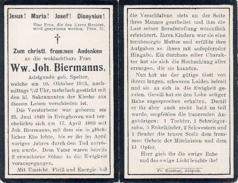 | ∞ 17.4.1883 Johann Biermanns, † April 1912; von den Kindern 2 erwachsene Söhne †; 1 überlebende Tochter; Druck in Zülpich |