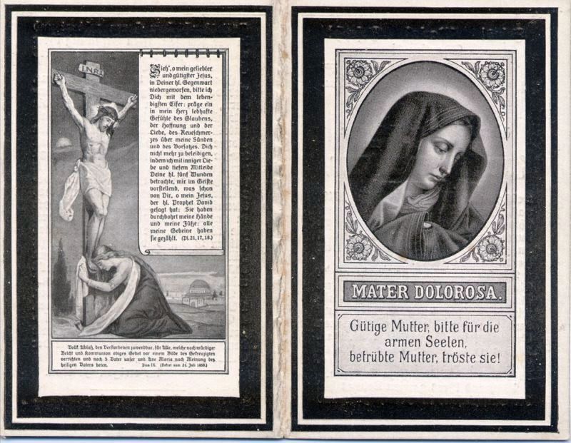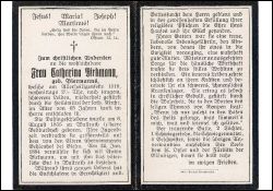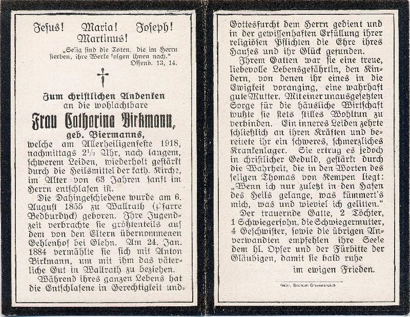 | Jugendzeit auf dem Gehlenhof in Glehn; ∞ 24.1.1884 Anton Birkmann, mit ihm auf das väterl. Gut in Wallrath; 3 K., davon 1 †; schweres, schmerzliches Krankenlager |