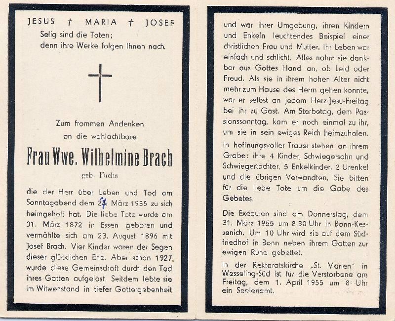 ∞ 23.8.1896 Josef Brach, † 1927; 4 K.; Exequien in Bonn-Kessenich |