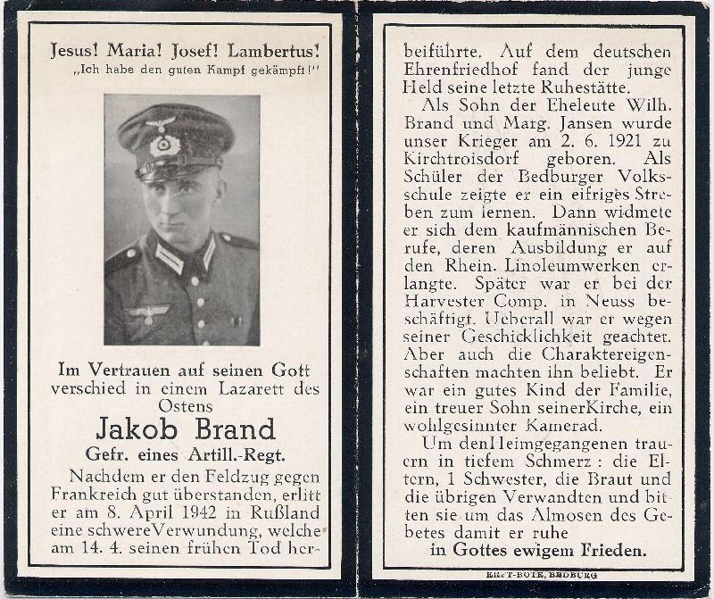 Gefallener 2. Weltkrieg; am 8.4.1942 schwer verwundet; Eltern: Wilhelm Brand u. Margarete geb. Jansen; Ausbildung als Kaufmann b. Rhein. Linoleumwerken in Bedburg; später b. Harvester Comp. in Neuss beschäftigt; verlobt |