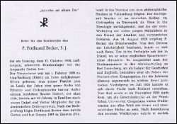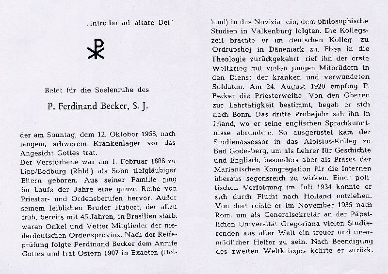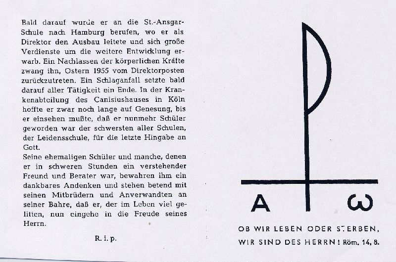 | Jesuitenpater; Langes Krankenlager; Bruder Hubert starb mit 45 J. als Missionar in Brasilien; Ostern 1937 Noviziat in Exaeten, Holland; Kollegszeit in Ordrupshoj, Dänemark; als Sanitäter Soldat im 2. Weltkrieg; Priesterweihe 24.8.1920; Lehrtätigkeit in Bonn, das dritte Probejahr in Irland; danach Stud.Ass. am Aloisius-Kolleg in Bad Godesberg; vor polit. Verfolgung floh er im Juli 1934 nach Holland; von dort nach Rom: Generalsekretär an päpst. Universität Gregoriana; nach Kriegsende nach Hamburg, Direktor der St.-Ansgar-Schule; Ostern 1955 Rücktritt; Schlaganfall; suchte vergebens Heilung in Krankenabteilung des Canisiushauses in Köln |