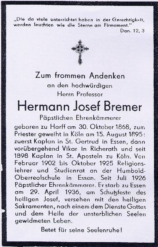 | Priesterweihe Köln 15.8.1895; Kaplan in St. Gertrud in Essen, dann vorübergehend Vikar in Richerath, seit 1898 Kaplan in St. Aposteln zu Köln; von 1902 bis 1925 Religionslehrer u. Studienrat an Humbold-Oberrealschule in Essen; seit Juli 1926 Päpstl. Ehrenkämmerer |