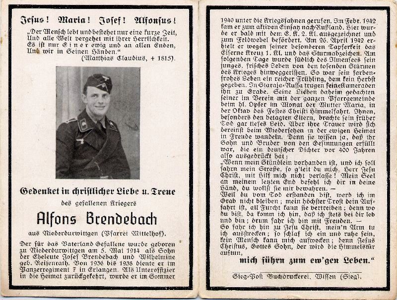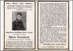 | Gefallener 2. Weltkrieg; Eltern: Josef Brendebach u. Wilhelmine geb. Reifenrath; Sommer 1940 unter die Kriegsfahnen gerufen; seit Febr. 1942 in Russland; beigesetzt in Staraja-Russa; Druck in Wissen, Sieg |