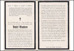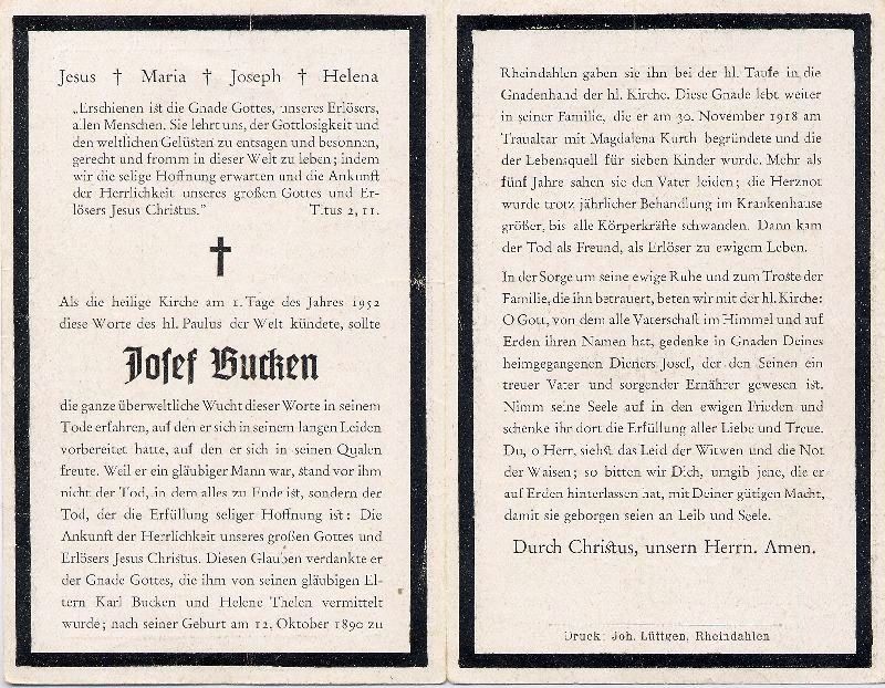 | Eltern: Karl Bucken u. Helene geb. Thelen; ∞ 30.11.1918 Magdalena Kurth; 7 K.; 5 J. leidend; wegen Herznot jährl. Behandlung im Krankenhaus; Druck in Rheindahlen |