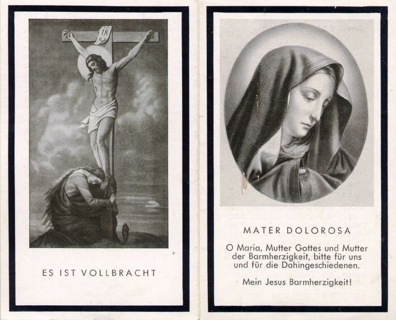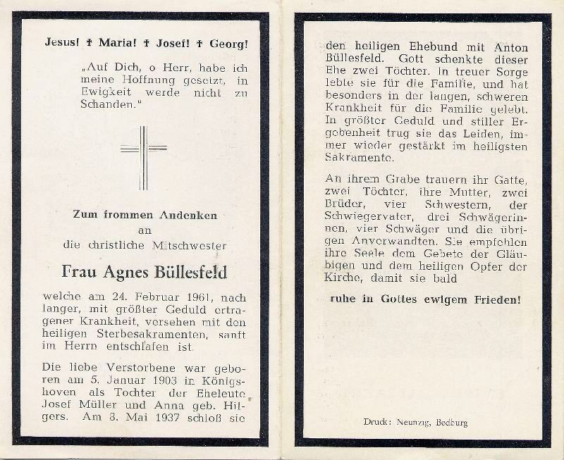 | Lange Krankheit; Eltern: Josef Müller u. Anna geb. Hilgers; ∞ 8.5.1937 Anton Büllesfeld; 2 Töchter; Druck in Bedburg |