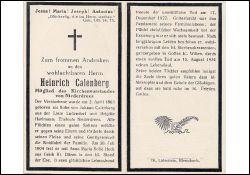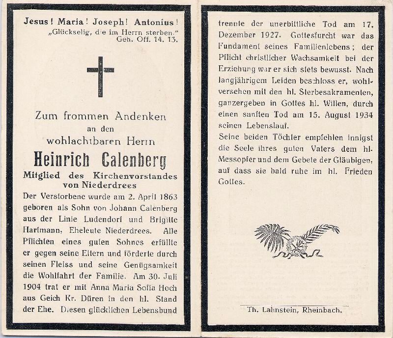 | Mitgl. Kirchenvorstand Niederdrees; Eltern: Johann Calenberg aus Ludendorf u. Brigitte Hartmann; ∞ 30.7.1904 Anna Maria Sofia Hoch aus Geich, Kr. Düren, † 17.12.1927; 2 Töchter; Druck in Rheinbach |
