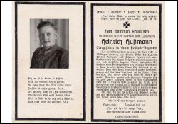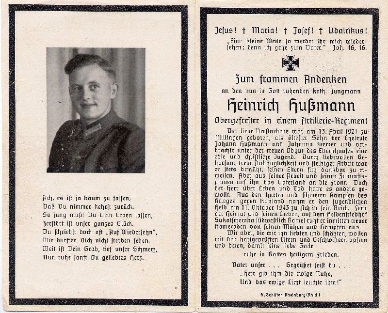 Gefallener 2. Weltkrieg; Eltern: Johann Hußmann u. Johanna geb. Kremer; Heldenfriedhof Sukatschewka südwestl. Gomel |