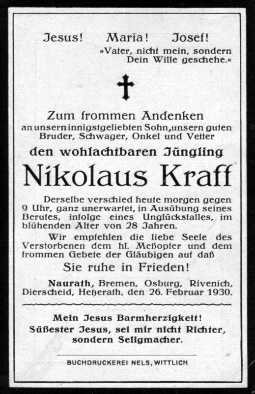 Jüngling; 28 J.; Tod durch Unglücksfall in Ausübung seines Berufes; Wohnort: Naurath; Druck in Wittlich |