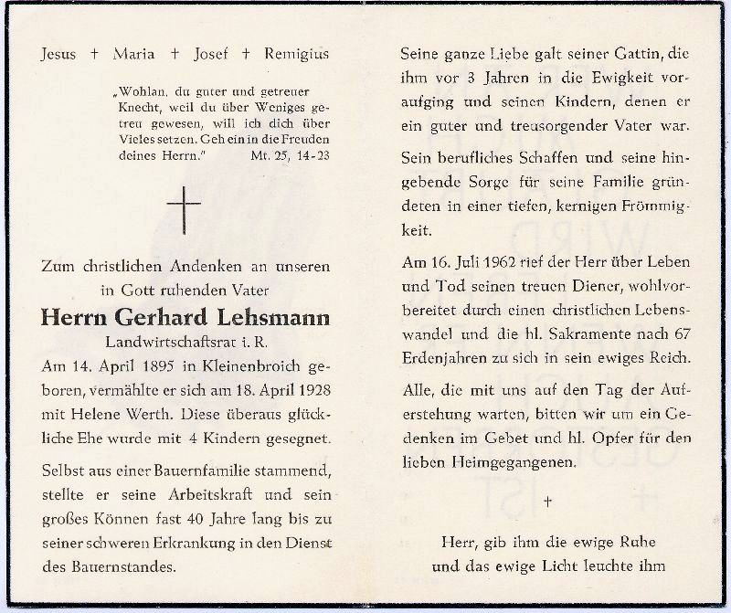 Landwirtschaftsrat i. R.; ∞ 18.4.1928 Helene Werth, † vor 3 J.; 4 K.; stammte aus Bauernfamilie; |