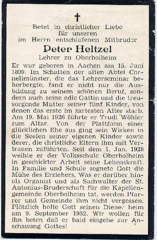 Lehrerseminar Kornelimünster; ∞ 19.5.1926 Trudi Wöhler; 5 K., davon 1 früh †; seit 1.1.1928 Lehrer in Oberbolheim; Organist u. Sachwalter der St. Antonius-Bruderschaft für die Kapellengemeinde Oberbolheim |