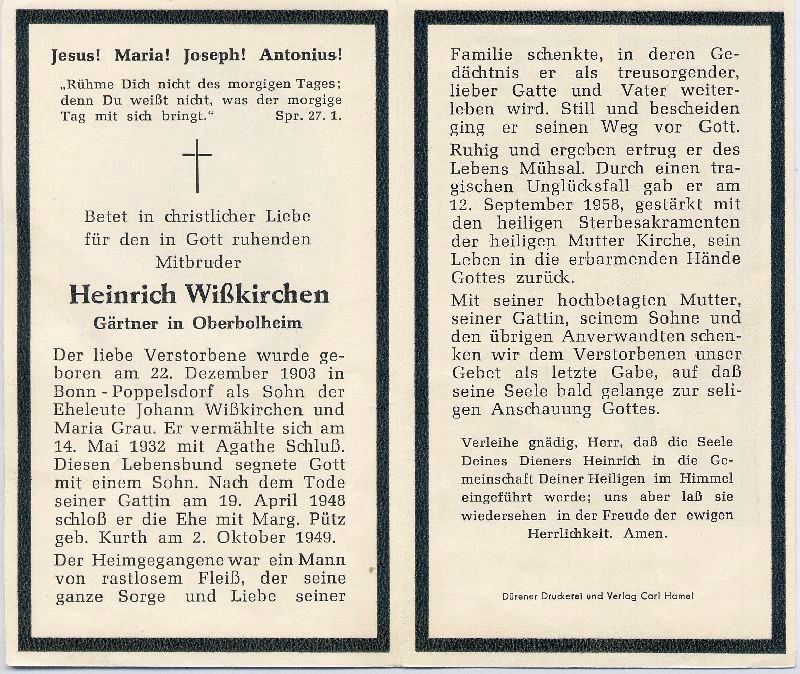 | Gärtner in Oberbolheim; Tod durch Unglücksfall; Eltern: Johann Wißkirchen u. Maria geb. Grau; ∞ 14.5.1932 Agathe Schluß, † 19.4.1948; 1 Sohn; ∞ 2.10.1949 Margarete Pütz geb. Kurth |
