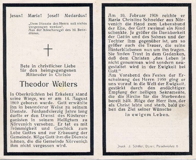 45 J. lang Küsterorganist in Nörvenich; ∞ 10.2.1906 Christine Schneider aus Nörvenich; 2 K. |
