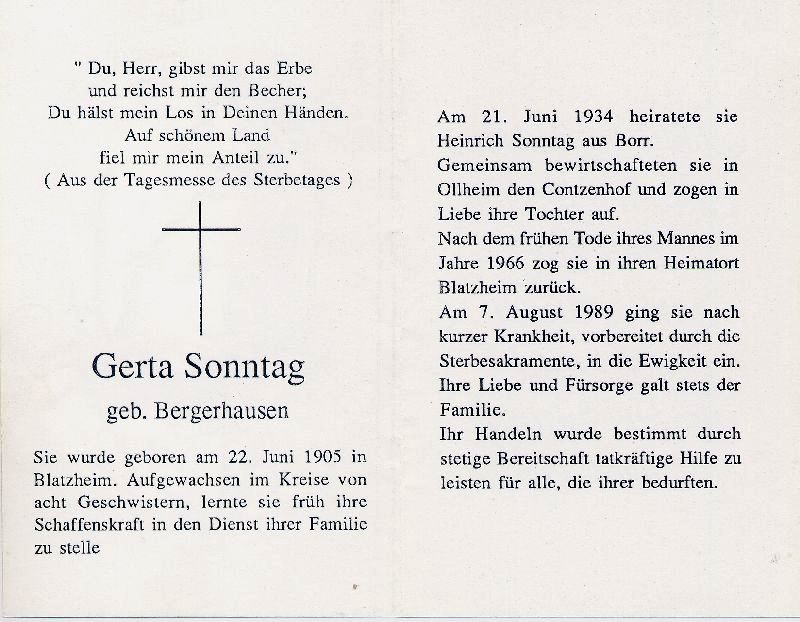 ∞ 21.6.1934 Heinrich Sonntag aus Borr; 1 Tochter; bewirtschafteten gemeinsam den Contzenhof in Ollheim; nach frühem Tod des Mannes kehrte sie 1966 nach Blatzheim zurück |