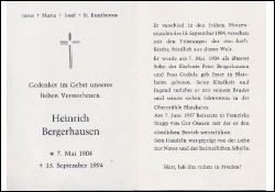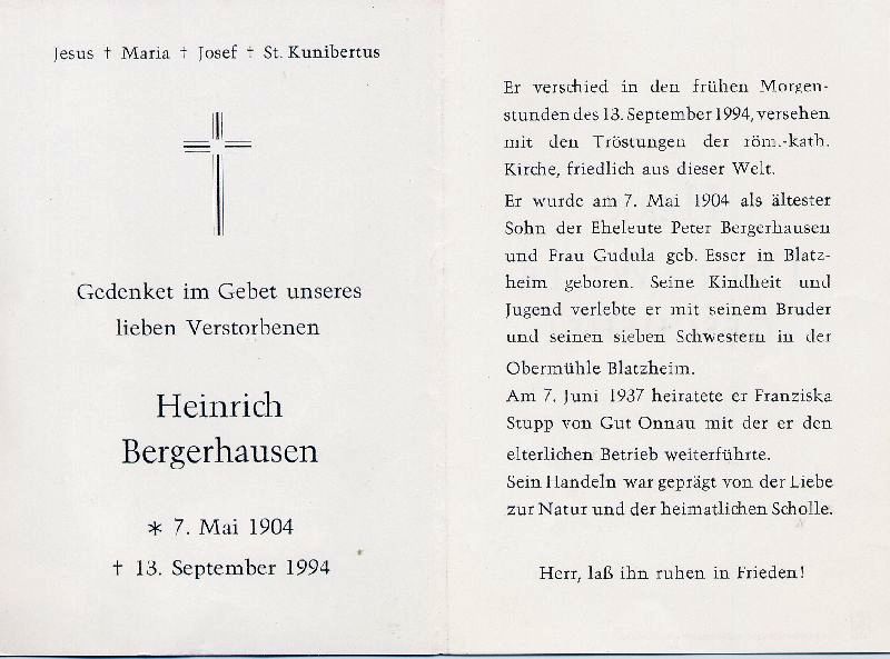 Eltern: Peter Bergerhausen u. Gudula geb. Esser; Kindheit u. Jugend verbrachte er mit zahlreichen Geschwistern in der Obermühle zu Blatzheim; ∞ 7.6.1937 Franziska Stupp von Gut Onnau, mit der er den elterlichen Betrieb weiterführte |