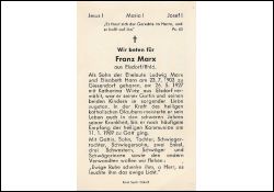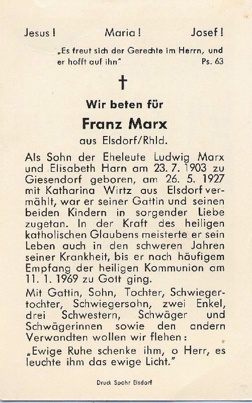 | Eltern: Ludwig Marx u. Elisabeth geb. Harn; ∞ 26.5.1927 Katharina Wirtz aus Elsdorf; 2 K.; Druck in Elsdorf |