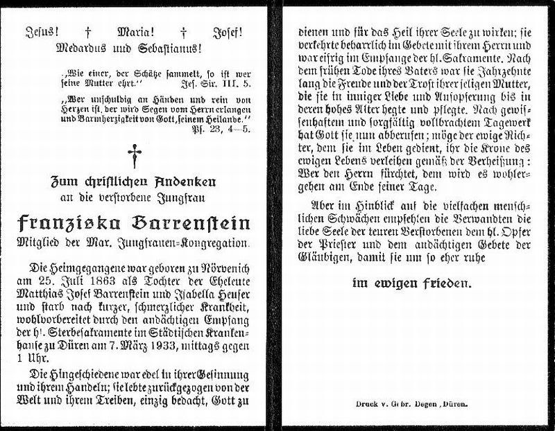 Eltern: Matthias Josef Barrenstein u. Isabella geb. Heuser; Mitgl. d. Jungfrauen-Kongregation |
