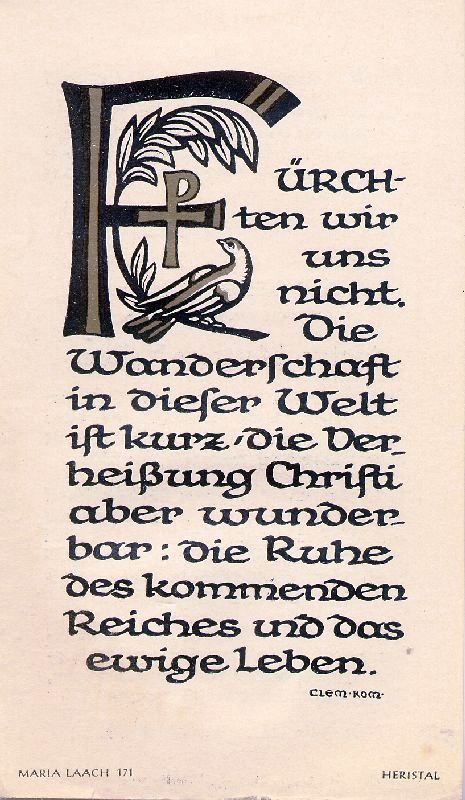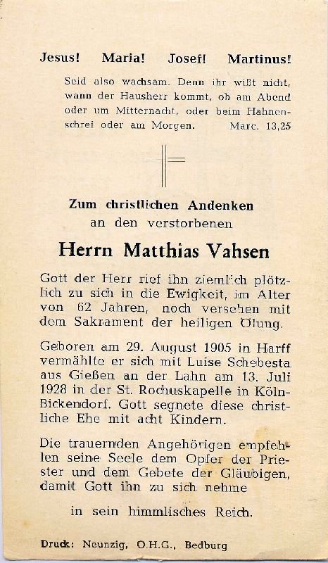 | 62 J.; ∞ 13.7.1928 in der St. Rochuskapelle in Köln-Bickendorf Luise Schebasta aus Gießen a.d.Lahn; Druck in Bedburg/Erft |