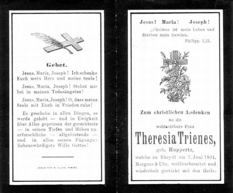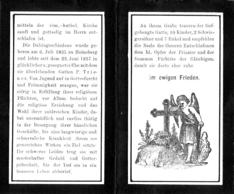 ∞ 23.6.1857 P. Rienes; 10 Kinder; langwieirige u. schmerzhafte Krankheit |