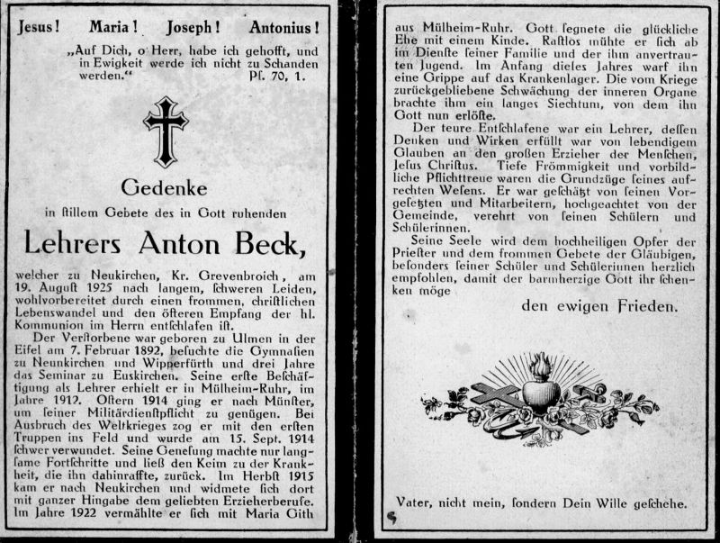 Lehrerseminar Euskirchen; 1912 Lehrer in Mülheim-Ruhr; im 1. Weltkrieg 15.9.1914 schwere Verwundung, an deren Folgen er später †; 1915 Lehrer in Neukirchen; ∞ 1922 Maria Gith aus Mülheim-Ruhr; 1 K. |
