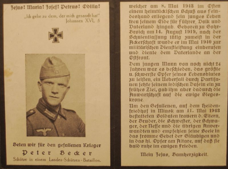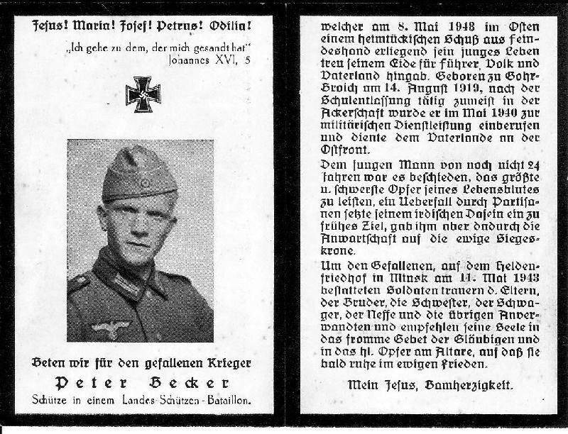 Gefallener 2. Weltkrieg (bei Überfall durch Partisamen); am 11.5.1943 bestattet auf dem Heldenfried hof in Minsk |