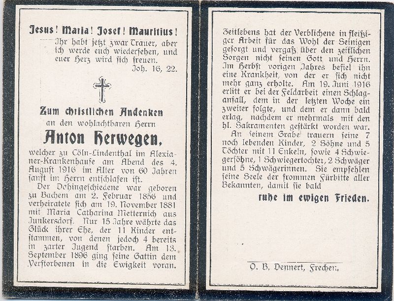 ∞ 19.11.1881 Maria Catharina Metternich aus Junkersdorf; 11 K., davon 4 früh †; Schlaganfall bei der Feldarbeit; Druck in Frechen |