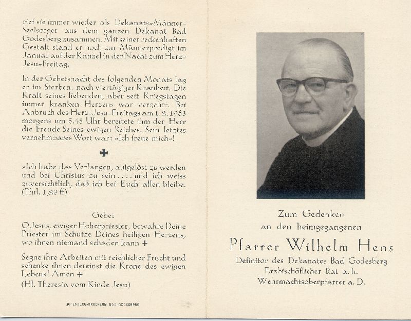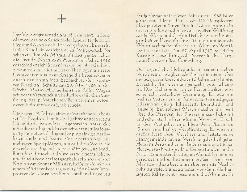 Eltern: Heinrich Hens u. Maria geb. Trockel; Kindheit in Wuppertal; im 1. Weltkrieg schwer verwundet; Priesterweihe Köln 29.5.1920; 12 J. Kaplan in Liebfrauenpfarre in Düsseldorf; danach 6 J. Kaplan am Münster in Bonn; Religionslehrer an Mädchenlyzeum; 1936 Garnisonpfarrer in Bonn; 1938 Divisionspfarrer in Kaiserslautern; zur West- u. Ostfront im 2. Weltkrieg; Herzinfarkt vor Leningrad; Wehrmachtsopberpfarrer in Münster/Westf.; seit 27.4.1947 Pfarrer in Bad Godesberg, Herz Jesu; |
