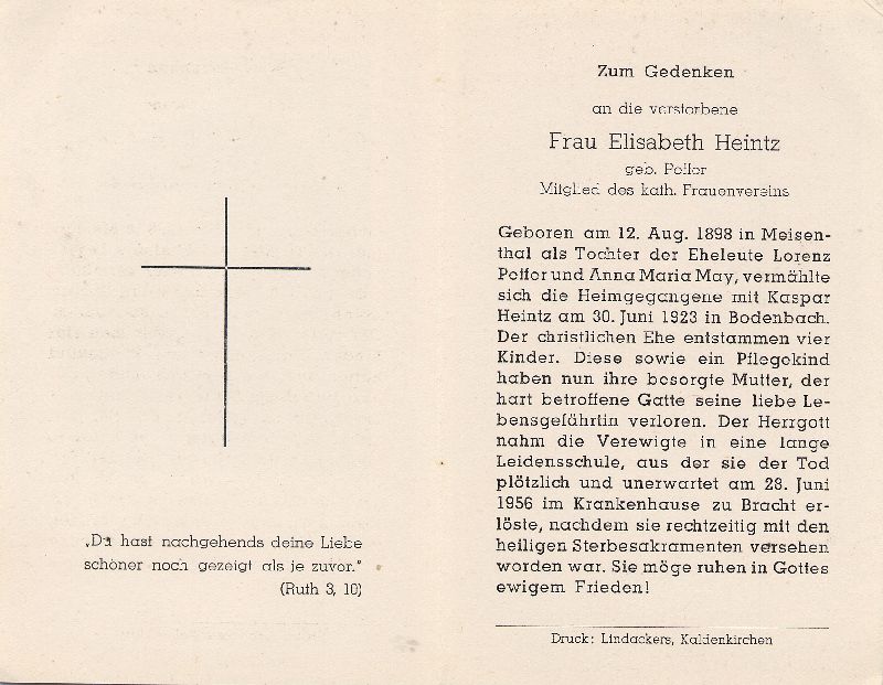 Eltern: Lorenz Peffer u. Anna Maria geb. May; ∞ 30.6.1923 in Bodenbach Kaspar Heintz; 4 leibl. K. sowie 1 Pflegekind; Druck in Kaldenkirchen |