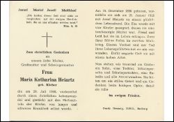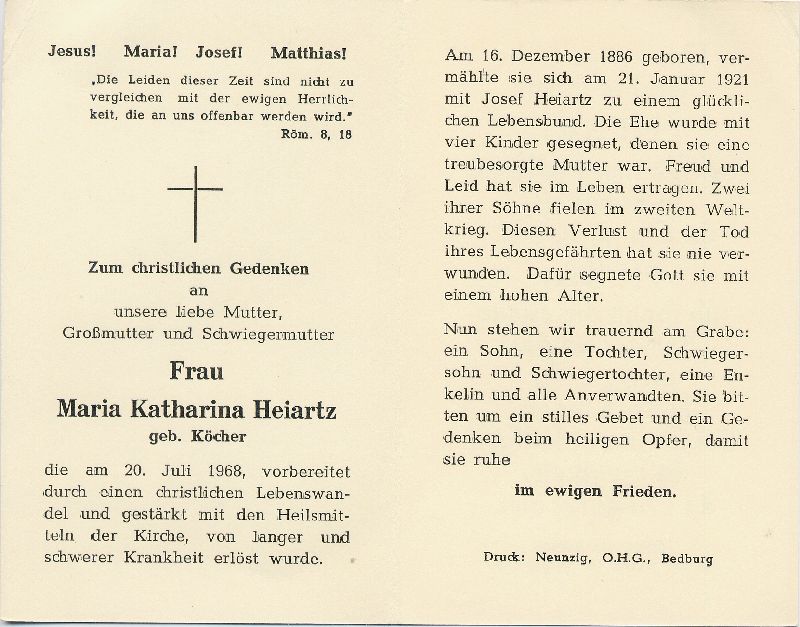∞ 21.1.1921 Josef Heiartz, † ; 4 K.; 2 Söhne im 2. Weltkrieg gefallen; Druck in Bedburg/Erft |