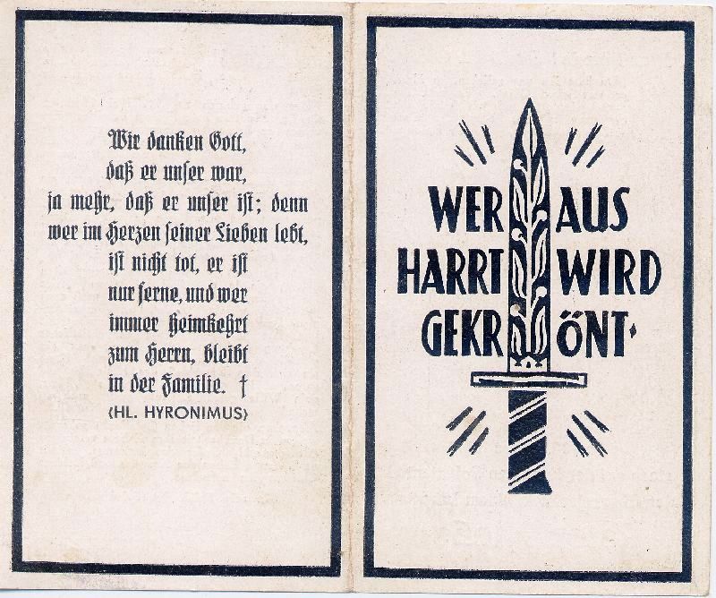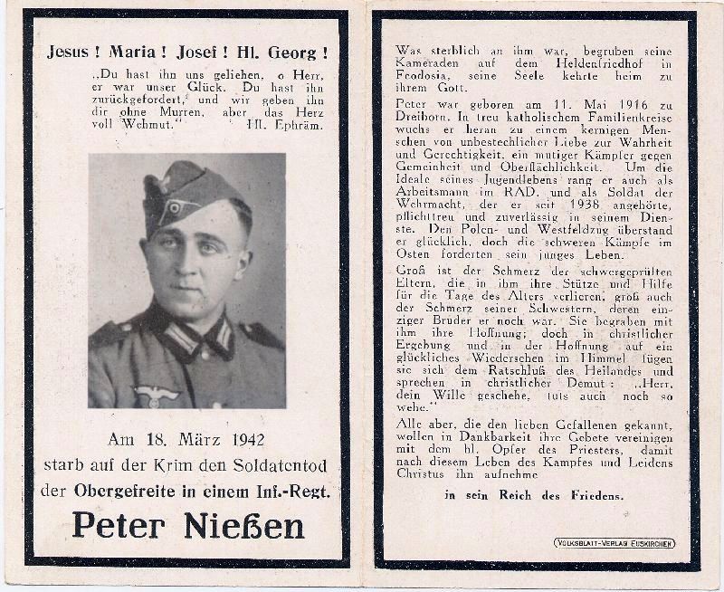 Gefallener 2. Weltkrieg; Heldenfriedhof Feodosia; nach Reichsarbeitsdienst seit 1938 bei der Wehrmacht; als Soldat in Polen, Frankreich, dann im Osten; Druck in Euskirchen |