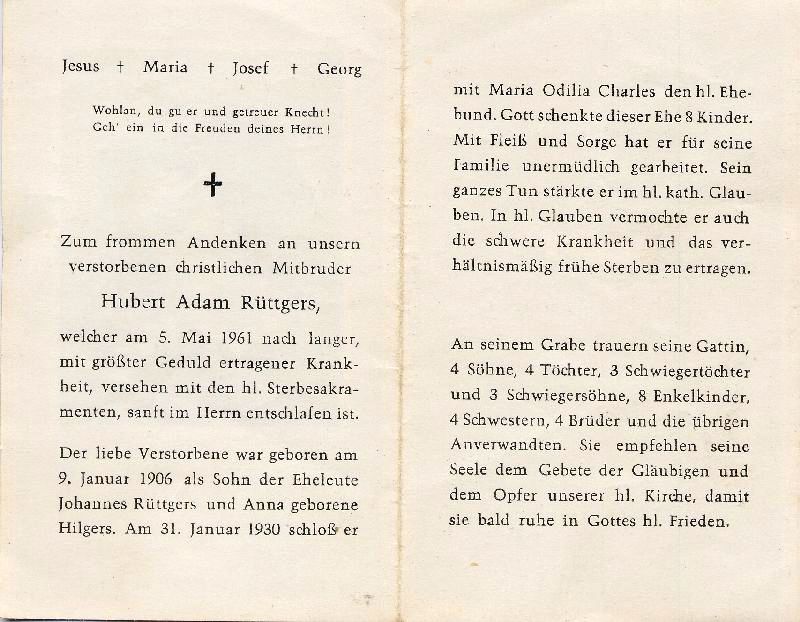Eltern: Johannes Rüttgers u. Anna geb. Hilgers; ∞ 31.1.1930 Maria Odilia Charles; 8 K. |