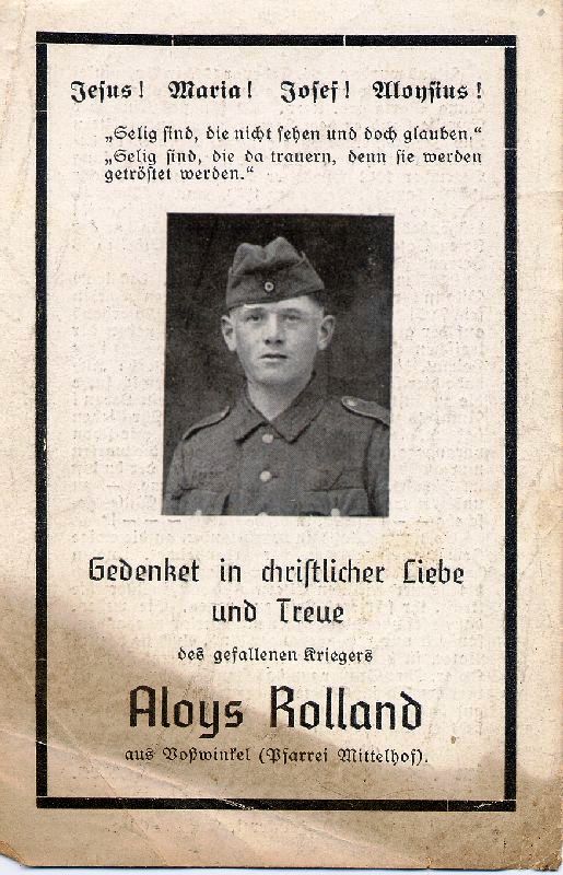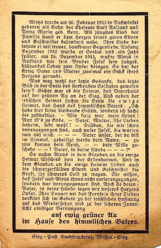 Gefallener 2. Weltkrieg; Einberufung Anfang Dezember 1942; auch Bruder Josef im 2. Weltkrieg gefallen; Druck in Wissen/Sieg |