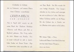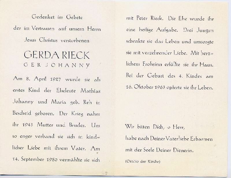 Eltern: Mathias Johanny u. Maria geb. Reh; durch den 2. Weltkrieg verlor sie 1943 Mutter und Bruder; ∞ 14.9.1950 Peter Rieck; 3 J.; bei der Geburt des 4. Kindes starb sie. |