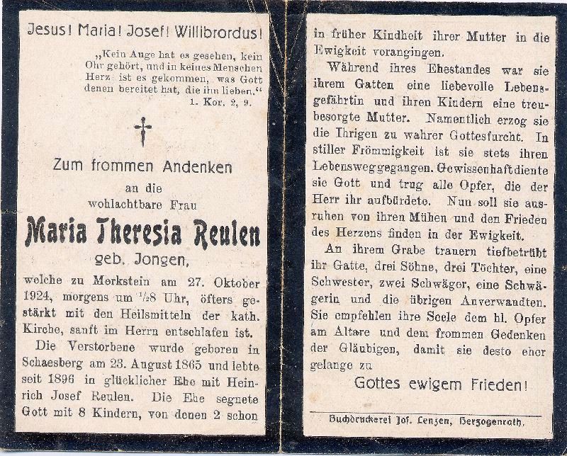 ∞ 1896 Heinrich Josef Reulen; 8 K., davon 2 früh †; Druck in Herzogenrath |