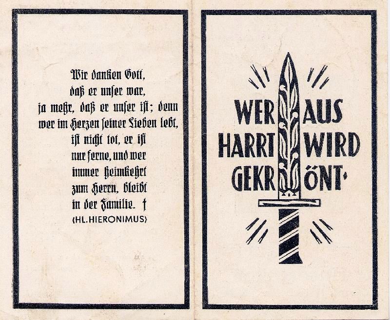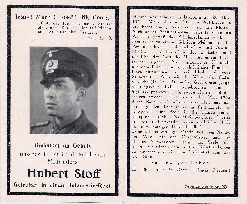 Gefallener 2. Weltkrieg; verlor seine Mutter, während sein Vater im 1. Weltkrieg an der Front stand; Schumacherhandwerk; ∞ 6.10.1940 Anna Heinen aus Berescheid; 1 Tochter; am 16.3.1942 schwer verwundet |