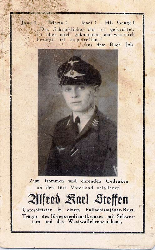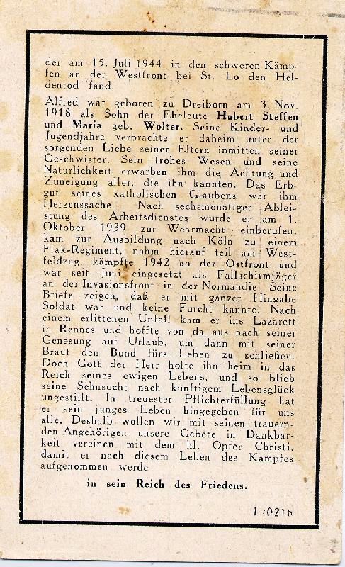 Gefallener 2. Weltkrieg; Eltern: Hubert Steffen u. Maria geb. Wolter; 1.10.1939 Einberufung; erst in Frankreich, dann 1942 an die Ostfront; seit Juni 1944 als Fallschirmjäger an der Invasionsfront in der Normandie; wegen Verletzung im Lazarett in Rennes, erhielt danach aber trotzdem keinen Urlaub |