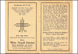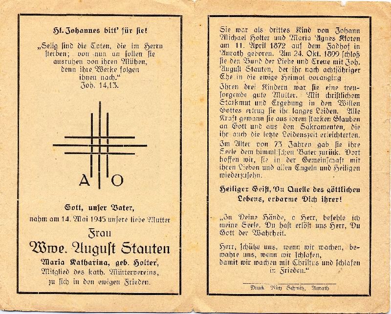 Eltern: Johann Michael Holter u. Maria Agnes geb. Kloten; ∞ 24.10.1899 Johann August Stauten, nach 8 J. †; 3 K.; langes Leiden; Druck in Anrath |
