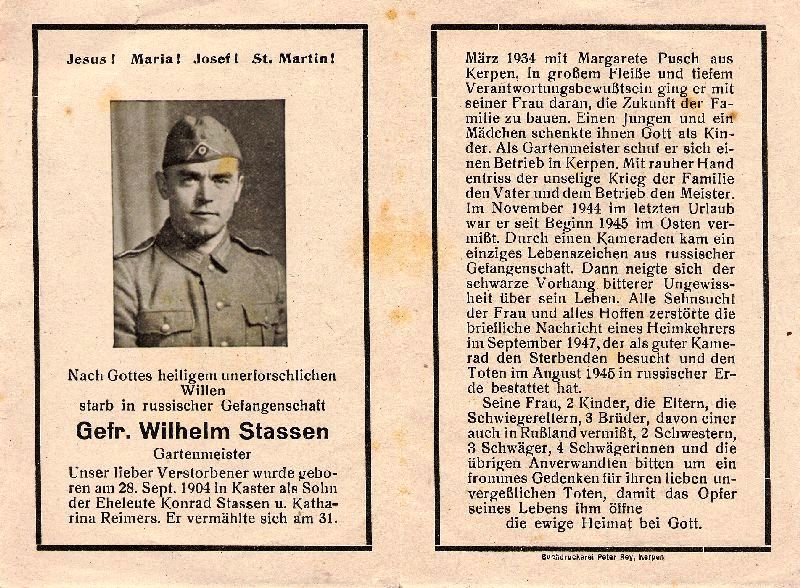 Gefallener 2. Weltkrieg; Gartenmeister; ∞ 31.3.1934 Margarete Pusch aus Kerpen; 2 K.; Gartenbetrieb in Kerpen; seit Beginn 1945 im Osten vermisst; Todesnachricht durch heimkehrenden Kameraden im September 1947; Druck in Kerpen |