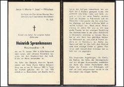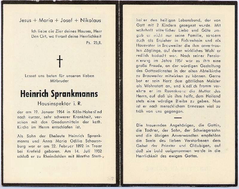 Hausinspektor i. R.; Eltern: Heinrich Sprankmanns u. Anna Maria Odilia geb. Schauenburg; ∞ 14.7.1932 in Rheindahlen Martha Statthalter; 2 K.; Erzichter in Fichtenhain; Hausvater in der Arbeitsanstalt Brauweiler; 1957 Pensionierung 1957; wirkte mit bei der Gestaltung der Abteikirche in Brauweiler; Wohnort Brauweiler |