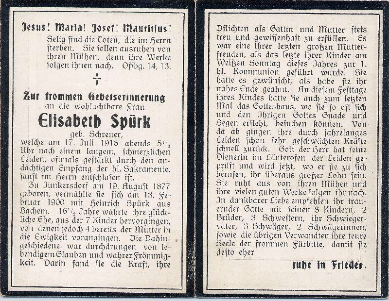 ∞ 13.2.1900 Heinrich Spürk aus Bachem; 7 K., davon 4 †; jahrelanges Leiden |