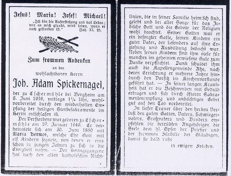 ∞ 30.6.1880 Maria Hermes; 11 K., davon 1 in jungen Jahren †; die Kapellengemeinde Ahe schuldet ihm Dank, wo er nach deren Errichtung den Vorsitz im Kircvhenvorstand führte; lange Krankheit |