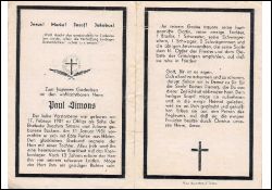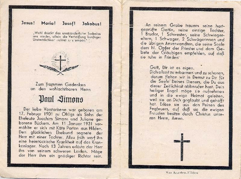 13 Jahre langes Krankenlager; Eltern: Joachim Simons u. Juliana geb. Bückem; ∞ 11.1.1931 Käte Porten aus Hilden; 1 Tochter; Druck in Hilden |