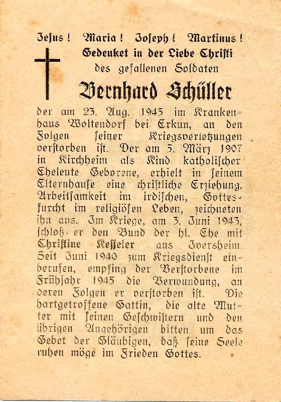 Gefallener 2. Weltkrieg; ∞ 3.6.1943 Christine Kesseler aus Iversheim; Juni 1940 Einberufung zur Wehrmacht; Frühjahr 1945 verwundet; er starb an den Folgen der Verwundung |