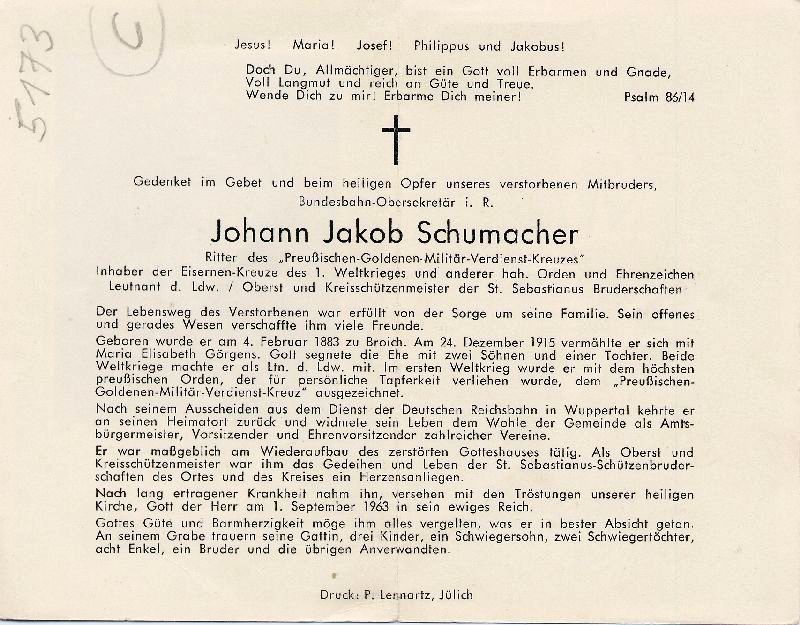 Bundesbahn-Obersekretär i. R.; Oberst u. Kreisschützenmeister der St. Sebastianus-Bruderschaften; ∞ 24.12.1915 Maria Elisabeth Görgens; 3 K.; in beiden Weltkriegen diente er als Ltn. d. Ldw.; bei der Dt. Reichsbahn in Wuppertal tätig; nach dem Ausscheiden aus dem Dienst kehrte er in seinen Heimatort zurück; dort Amtsbürgermeister u. Vorsitzender zahlreicher Vereine; beim Wiederaufbau der zerstörten Kirche tätig; Druck in Jülich |