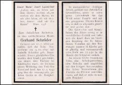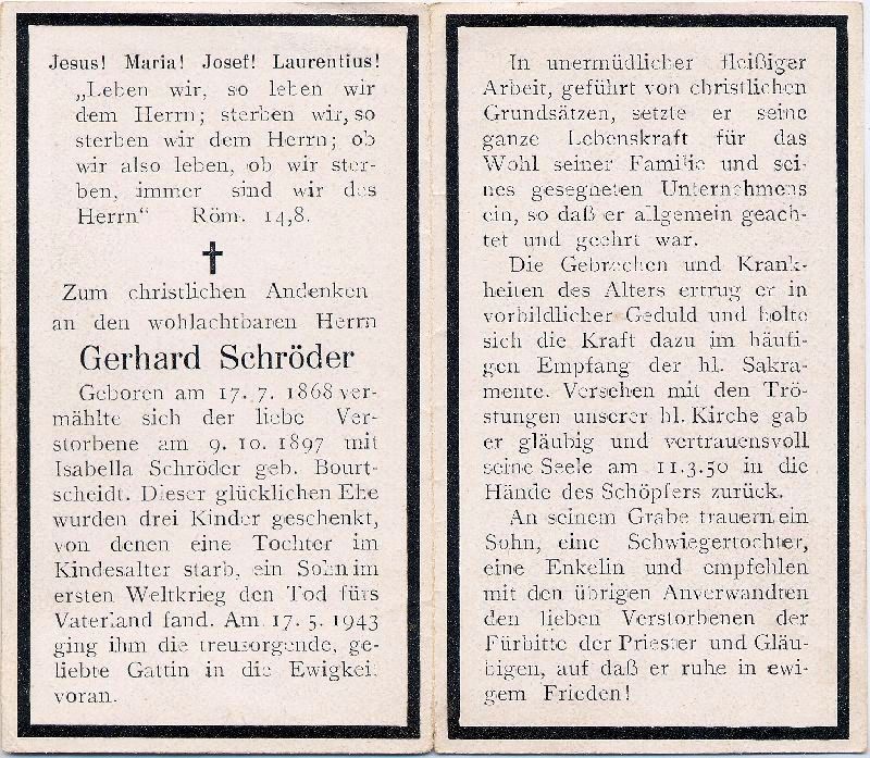 ∞ 9.10.1897 Isabella Schröder geb. Bourtscheidt, † 17.5.1943; 3 K., davon 1 T. †, 1 Sohn im 1. Weltkrieg gefallen; |